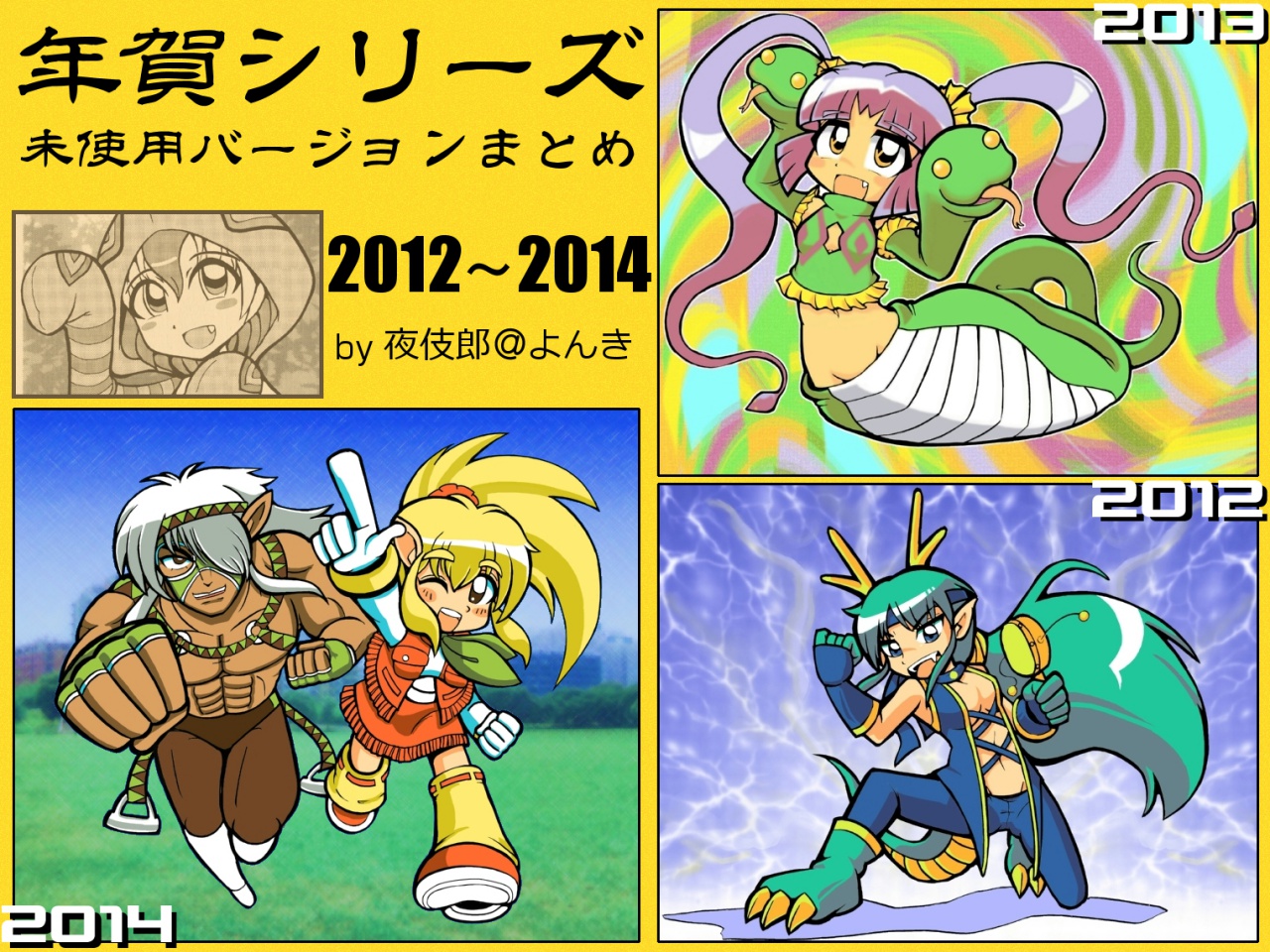 概ね、作画段階でグダグダになってやっぱりもう1枚・・・的な感じですが、2013年に関しては顔がなんとなくヘビっぽくない、という謎の動機で描き直したのを覚えております。