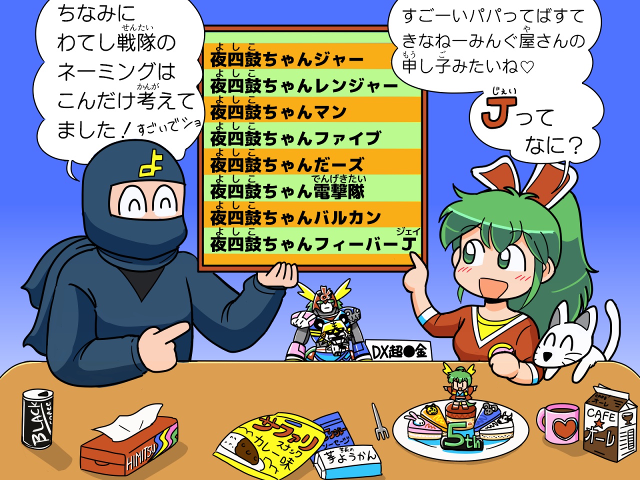 4年前のサイト15周年記念の時、夜四鼓ちゃんの先輩にあたる2人のサイボーグお姉さんたちと余興でよんバルカンごっこしたりとか、これまでにも挿絵やキャプションで小ネタとして扱うことはよくあったのですが、戦隊をメインテーマとして取り上げるのは意外と初めてではないでしょうか。